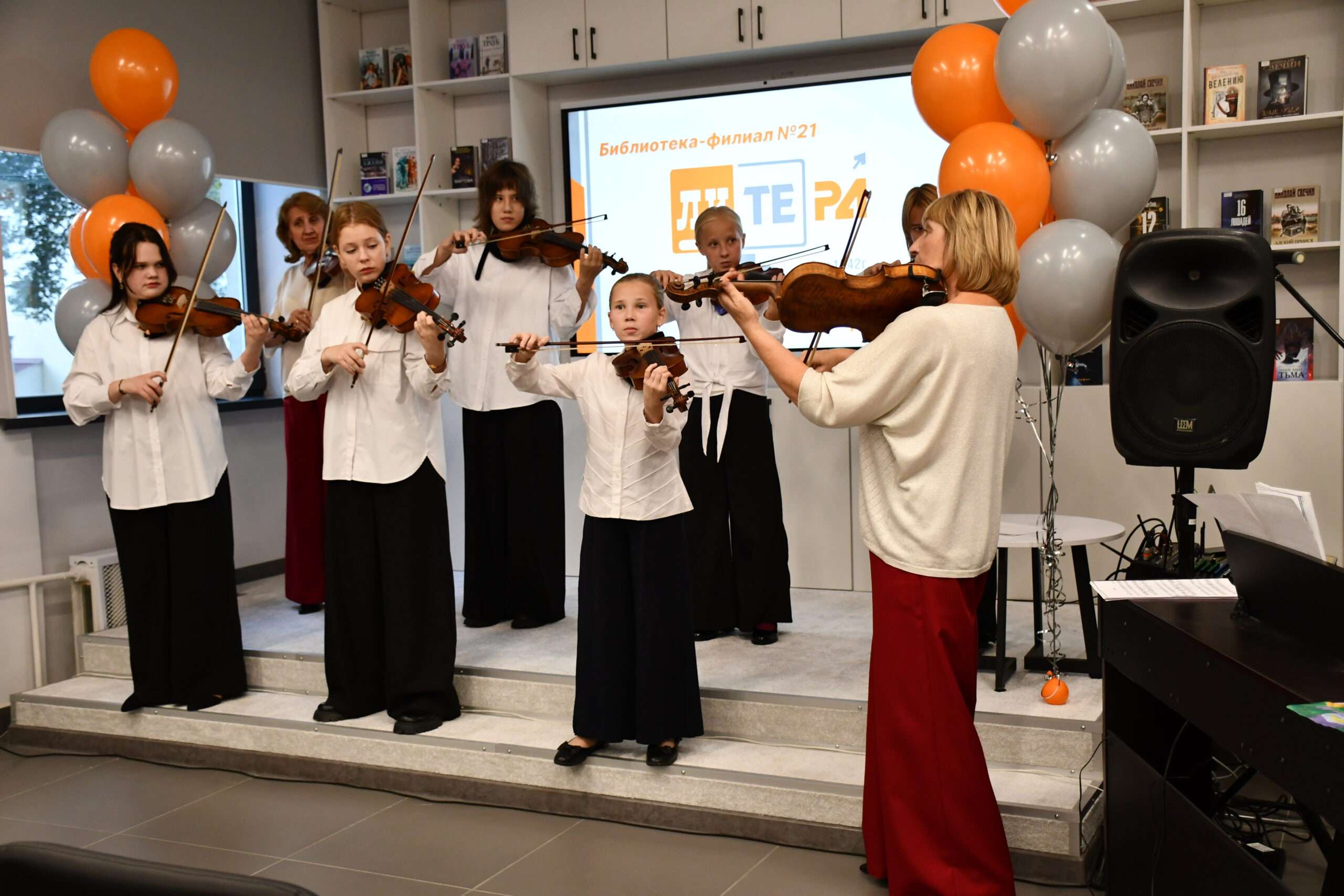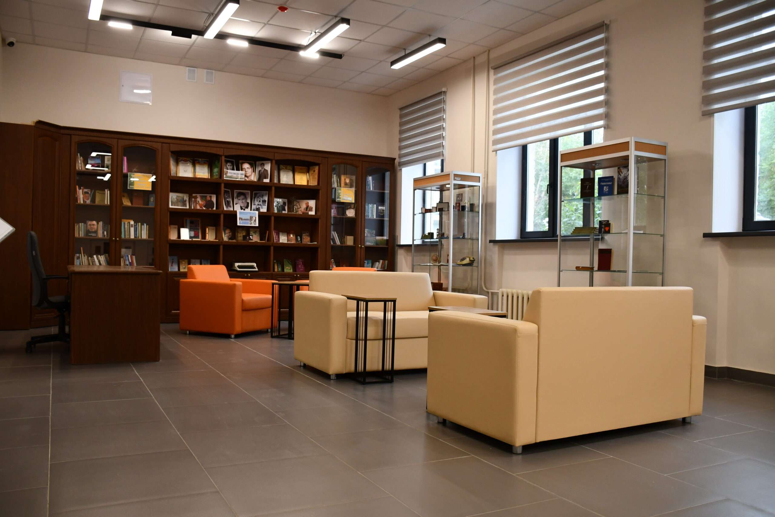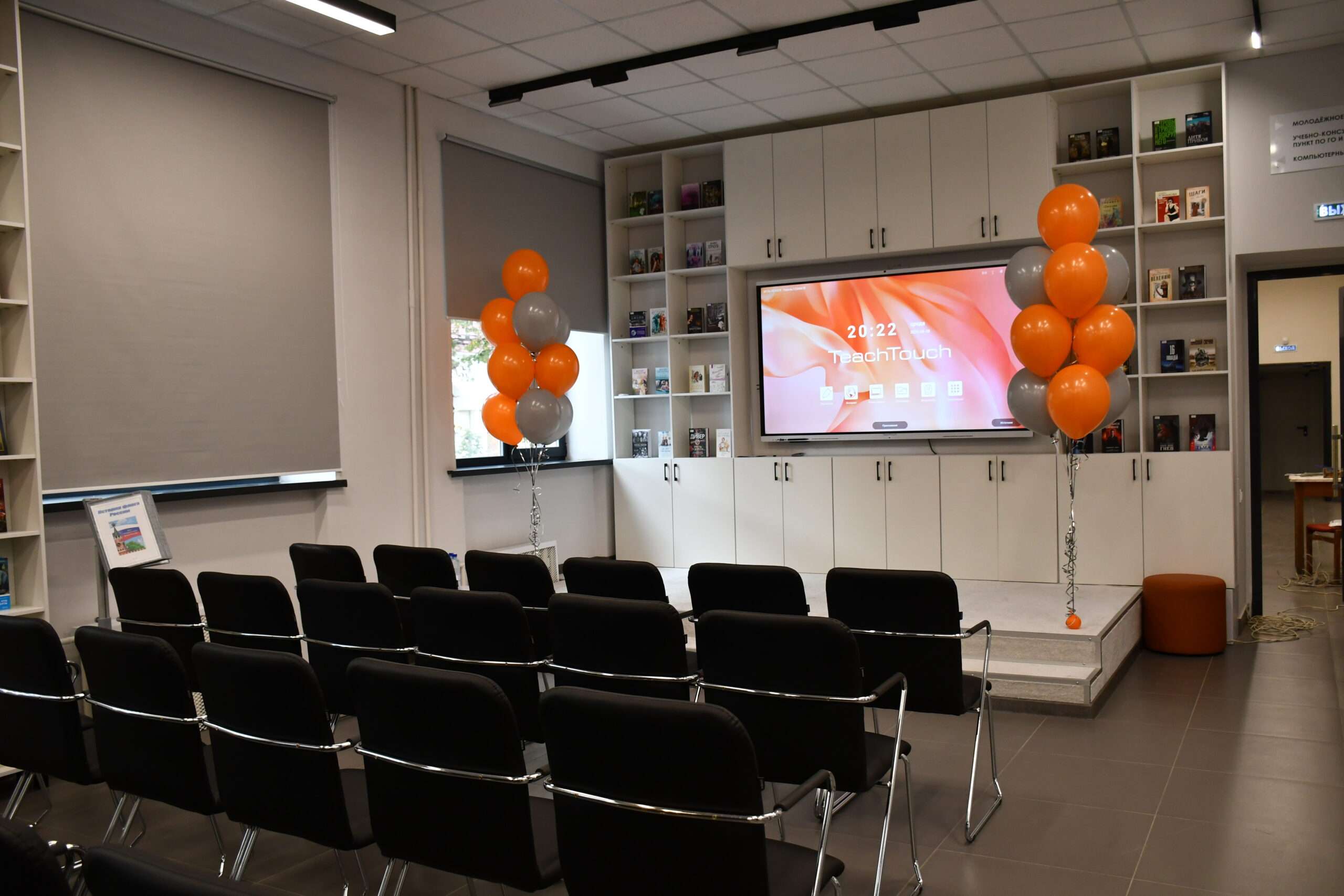 Одним из ключевых элементов обновленной библиотеки стал современный конференц-зал. Это пространство предназначено для проведения массовых мероприятий различного формата — от научных конференций и литературных чтений до встреч с интересными людьми. Для удобства проведения мероприятий зал оснащен жидкокристаллической интерактивной панелью для презентаций и системой кондиционирования для комфорта участников.