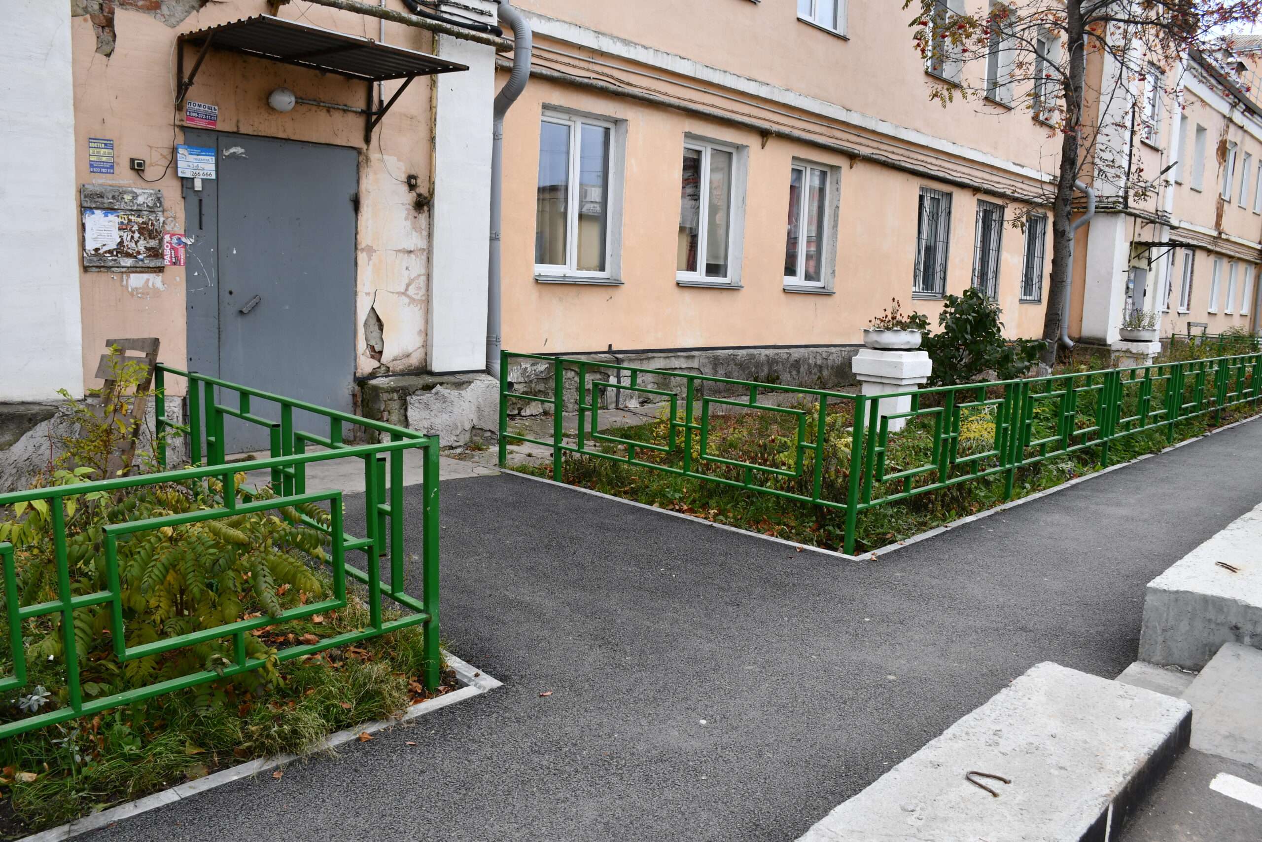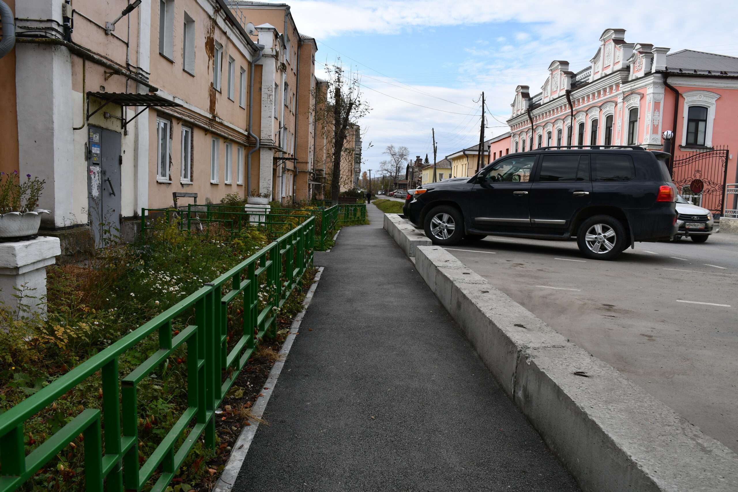 Но это еще не все. Под окнами привели в порядок палисадники: там росли высокие деревья, которые жители раньше спиливали за свой счет. В этом году появилась возможность убрать растительность в рамках благоустройства. Палисадники немного сместили — и получилось сделать широкий тротуар. Обновили ограждение, покрасили тумбы — маленький участок возле дома стал ухоженным и по-настоящему уютным.