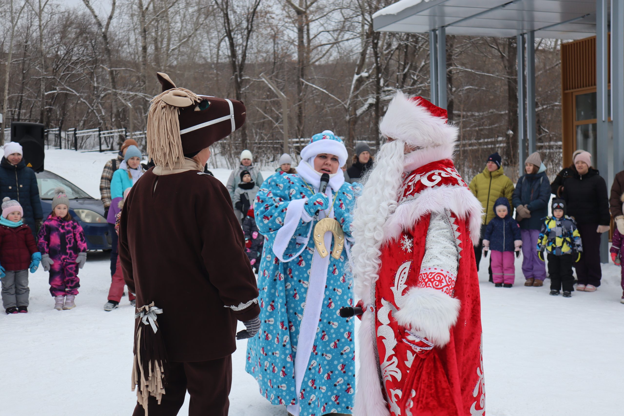 Символ ушедшего года – Змея и символ года наступившего – Лошадка ищут чудесную золотую подкову, исполняющую желания, которую украла сестра зимнего волшебника – Баба Мороз. Дед Мороз вместе с ребятами помогают вернуть потерю хозяйке. Ребятишки со своими родителями и бабушками и дедушками водят хороводы, играют и поют. А потом все получают сладкие гостинцы от доброго Дедушки Мороза.