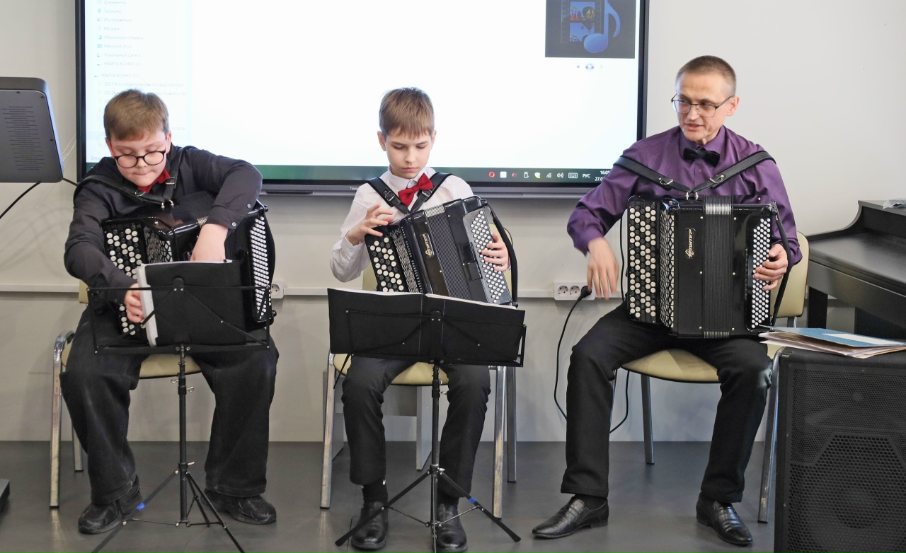 Наиль Михайлович показал и прокомментировал видеозаписи, сделанные на разных концертных площадках, рассказал об уникальных иструментах, на которых выступают его ученики: