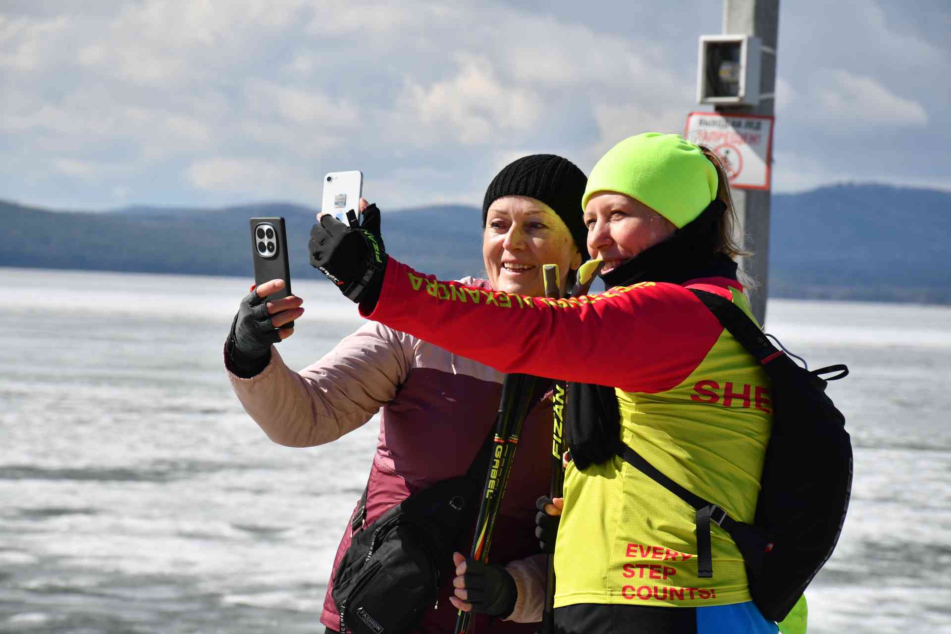 И вот — экватор! Перед глазами раскинулся Тургояк, едва затянутый тонкой ледяной корочкой. На отметке в семь тысяч шагов группа устроила привал: кто-то перекусывал, кто-то делал фотографии на фоне озера.