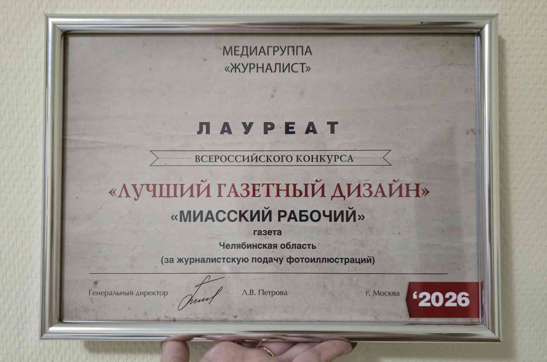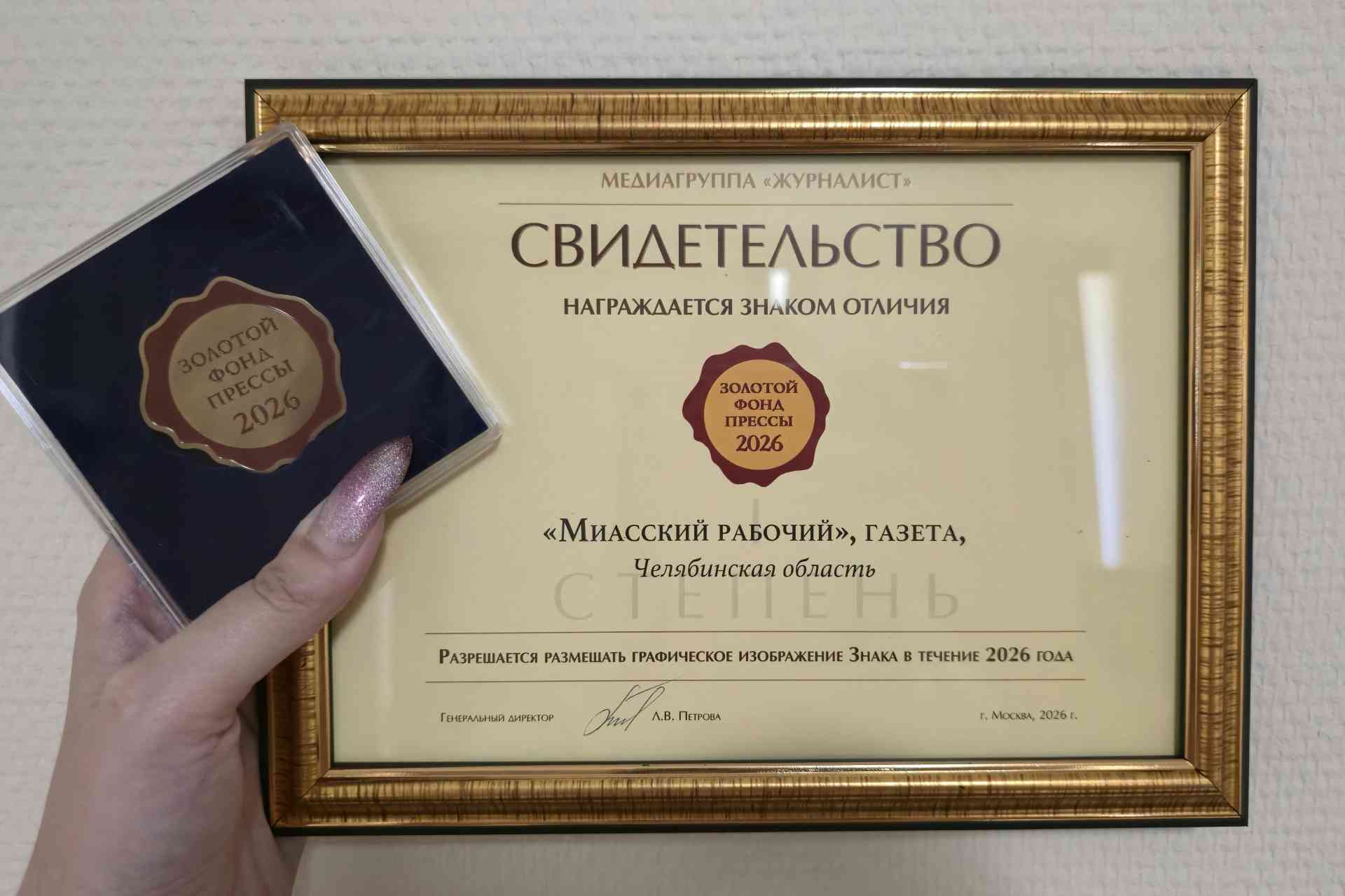 «Миасский рабочий», кроме свидетельства о награждении знаком отличия «Золотой фонд прессы — 2026» первой степени и самого знака, получил диплом лауреата всероссийского конкурса «Лучший газетный дизайн». Наше издание отметили за журналистскую подачу фотоиллюстраций.